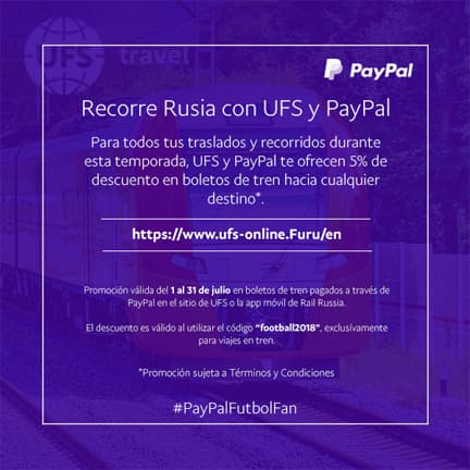 Para todos tus traslados y recorridos durante esta temporada, UFS y PayPal te ofrecen 5% de descuento en boletos de tren hacia cualquier destino. Promoción válida del 1 al 31 de julio en boletos de tren pagados a través de PayPal en el sitio de UFS o la app móvil de Rail Russia.